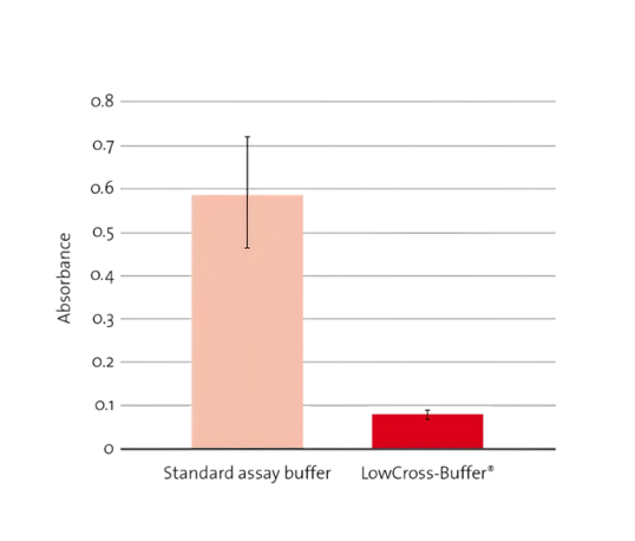 图一:在ELISA检测中,相较于普通缓冲液,LowCross-Buffer® (CR303) 可显著降低由交叉反应引起的背景干扰,有效提升检测信噪比。