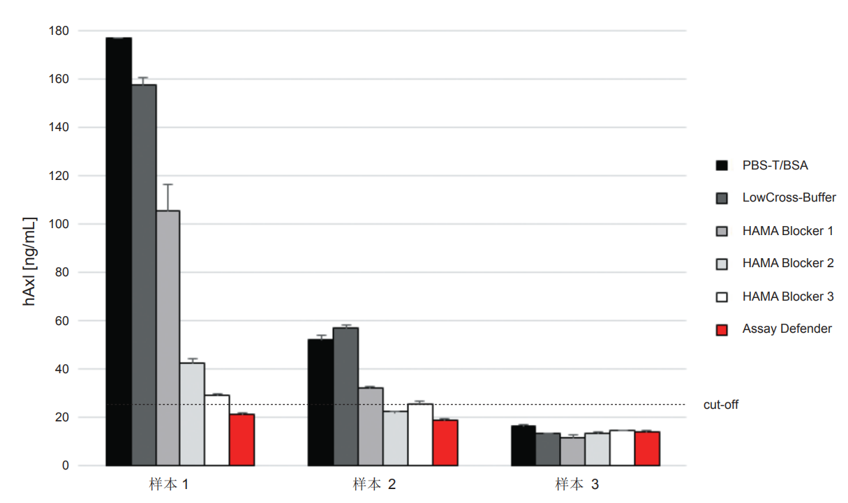 使用ELISA方法,检测来自类风湿性疾病患者(样本1和2)的血清样本中肝癌细胞生物标记物hAxl的表达情况。样本3是来自健康人的无干扰血清样本。样本分别用单独PBS-T/BSA、PBS-T/BSA +HAMA Blocker 1/HAMA Blocker 2 / HAMA Blocker 3、CANDOR的Assay Defender®进行稀释。单 独 使 用 Assay Defender®即可完全消除干扰,因此对这两组干扰样本给出正确的阴性结果 (< 25 ng/mL) 。 无 干 扰 的 样 本 结 果 不 受 Assay Defender®影响。